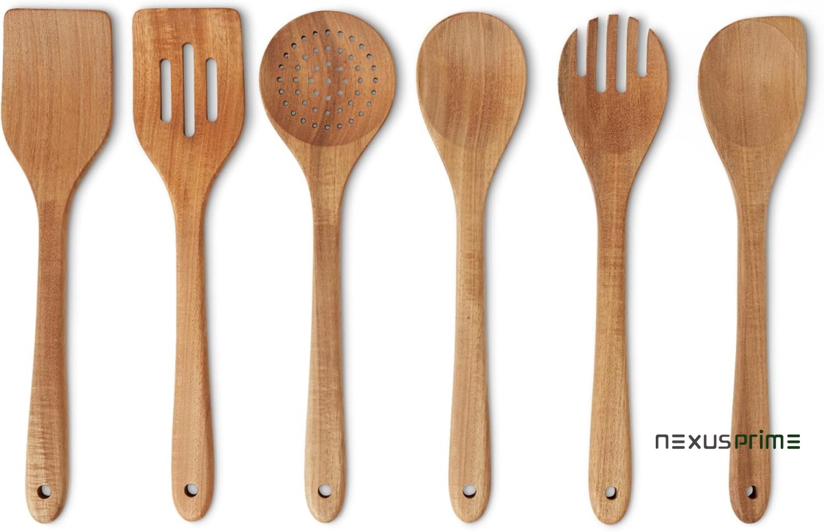 Utensili da Cucina in Legno, Set di 6 Pezzi, Legno di Acacia, Pre-Trattati con Olio, Sicuri per l’Uso con le Pentole